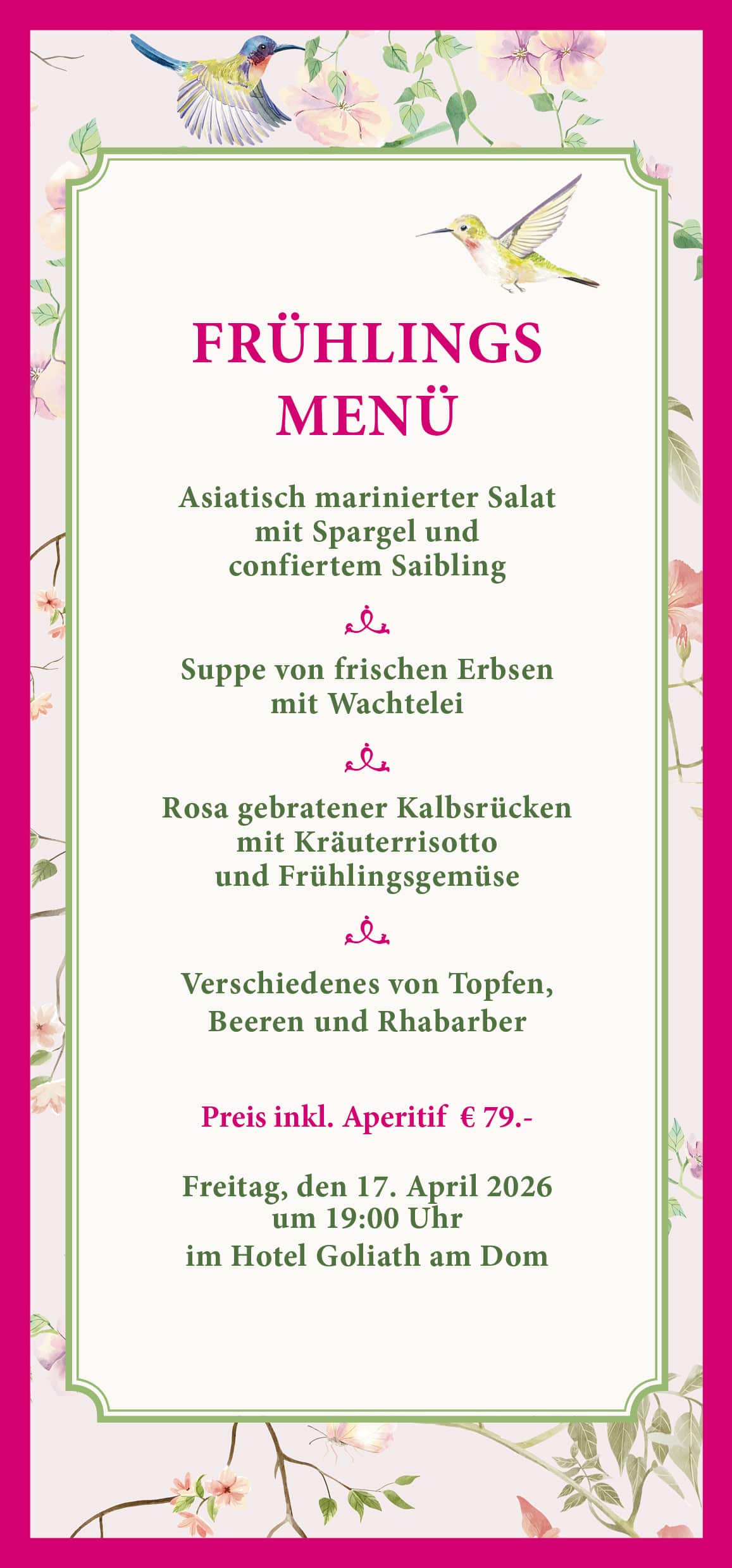 Am Freitag, dem 17. April um 19 Uhr servieren wir ein Frühlingsmenü mit Wachtelei, Saibling und Kalbsrücken. Hier mehr zum Menü